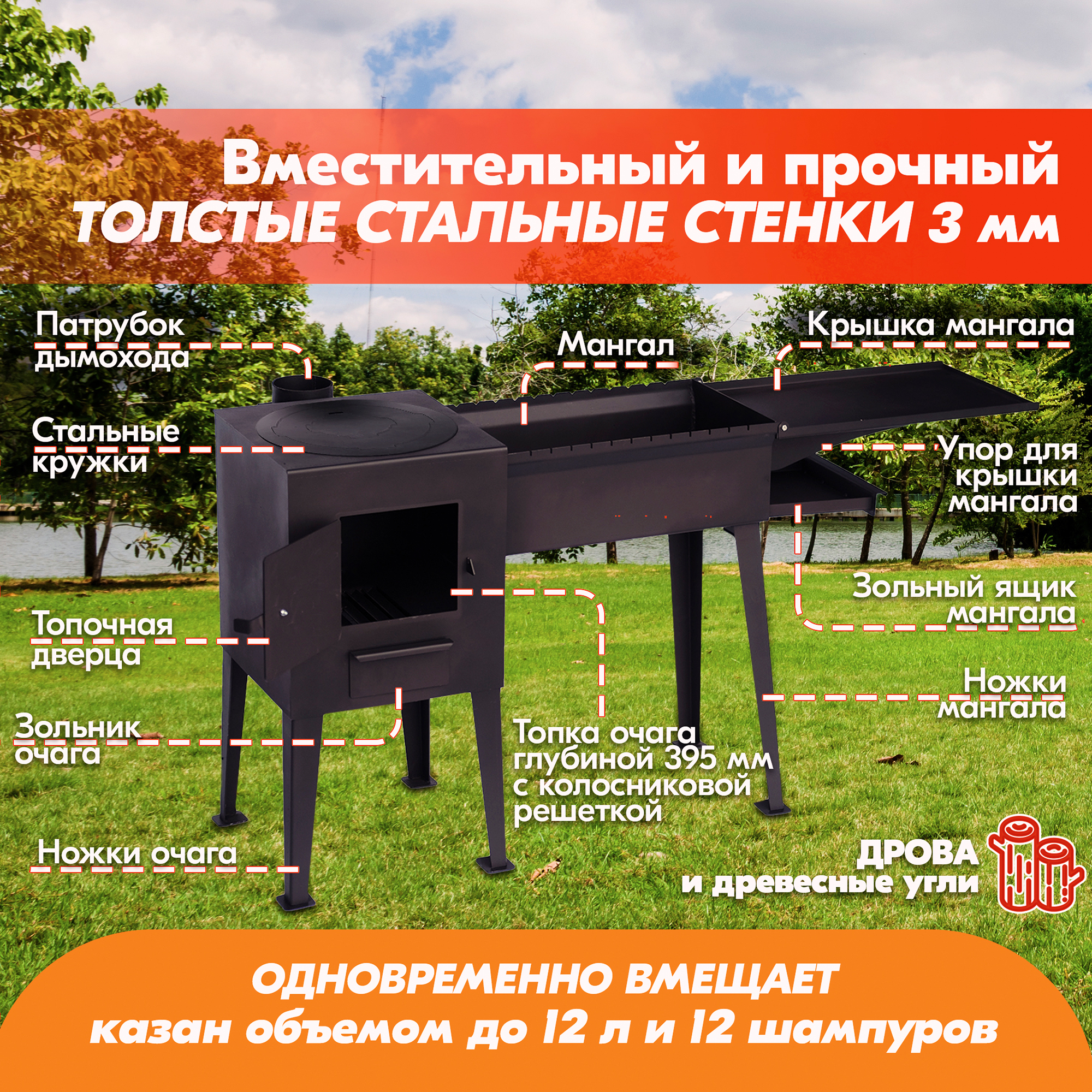 Казан-мангал с крышкой и зольником - идеален для дачи. Удобно готовить мясо, рыбу и овощи на открытом огне. Настоящий гастрономический праздник!