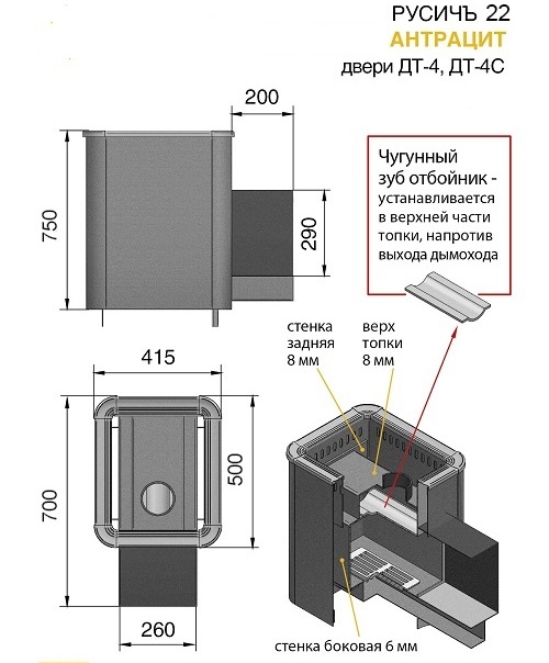 Топка печи выполнена из специальной конструкционной стали толщиной до 12 мм. Сталь благодаря своей устойчивости к высоким температурам не подвергается деформации. Топочная дверца изготовлена из высококачественного чугуна. Длинная колосниковая решётка из массивного литейного чугуна, обеспечивает равномерное горение дров, столь необходимое для банной печи. Выдвижной зольный ящик позволяет удалить накопившуюся золу, не прерывая горения и эффективно регулировать его интенсивность. Все эти характеристики позволяют утверждать, что эту модель можно считать самой скоростной печкой по прогреву парильного помещения.