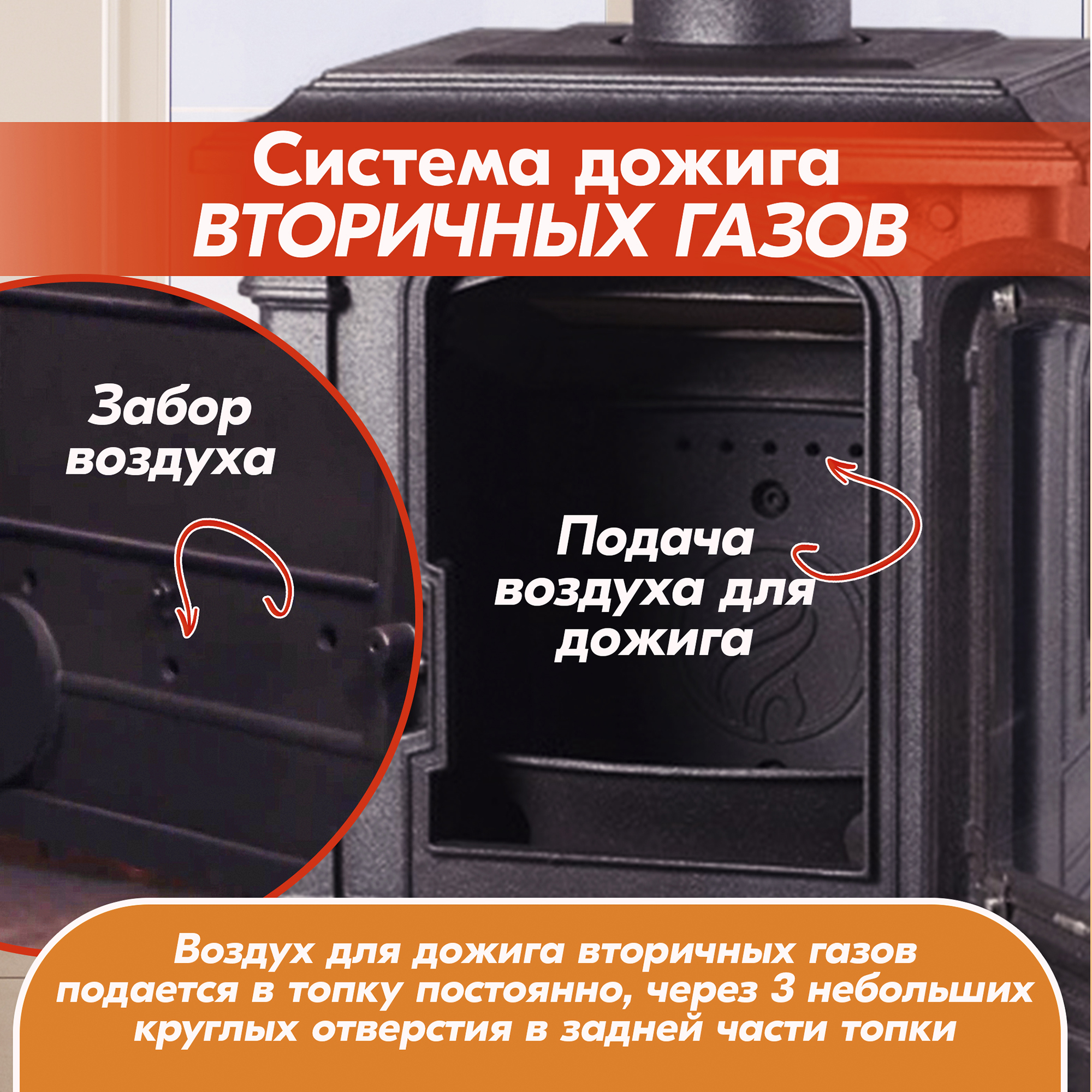 В конструкцию чугунной печи-камина внедрена система дожига вторичных (пиролизных) газов, позволяющая увеличить КПД камина до 82% и скорость нагрева отапливаемого помещения.
