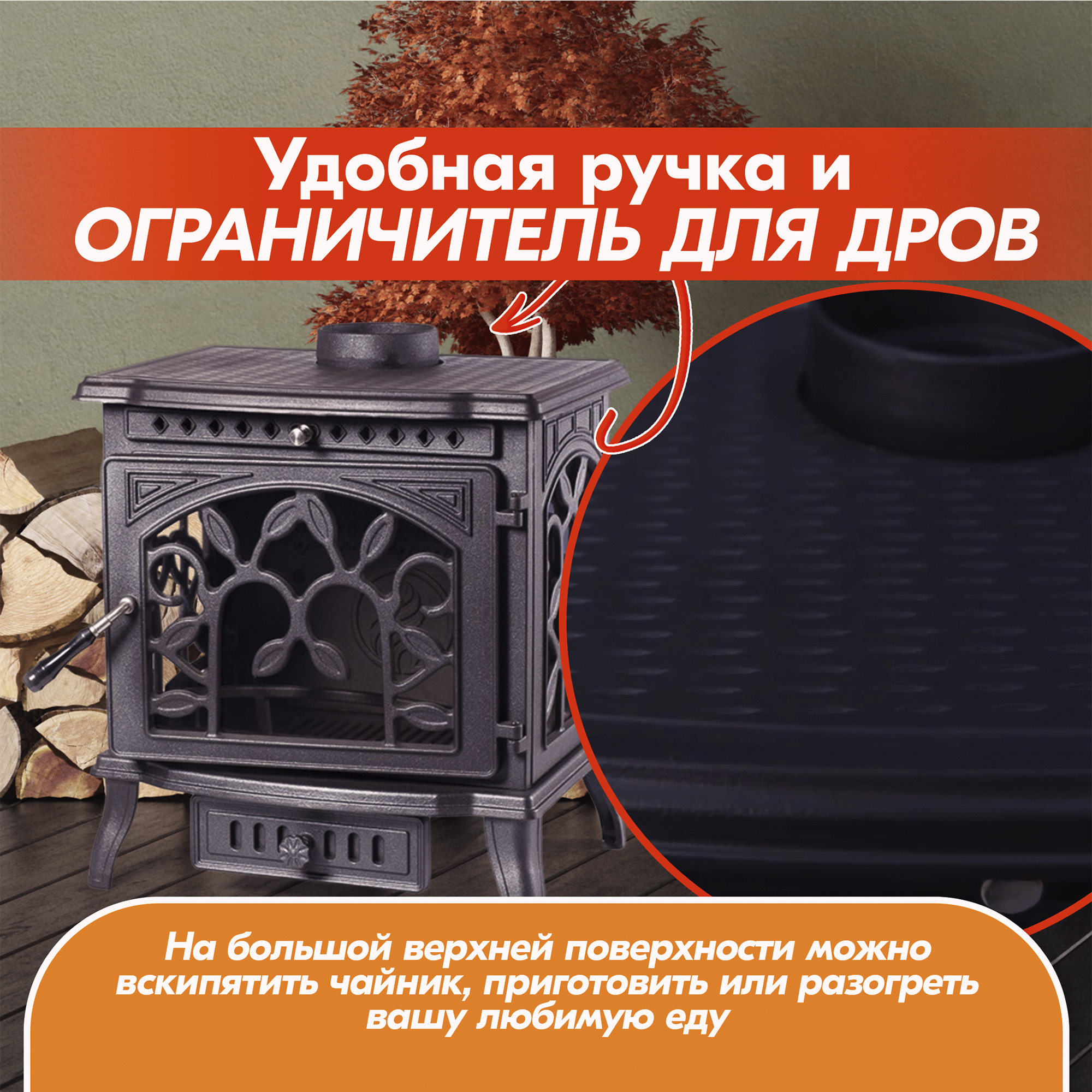 Бесспорным достоинством этой печи является ее интересный дизайн с тремя жаростойкими окнами, украшенными красивыми чугунными узорами, который привнесет в любое помещение свою изюминку.