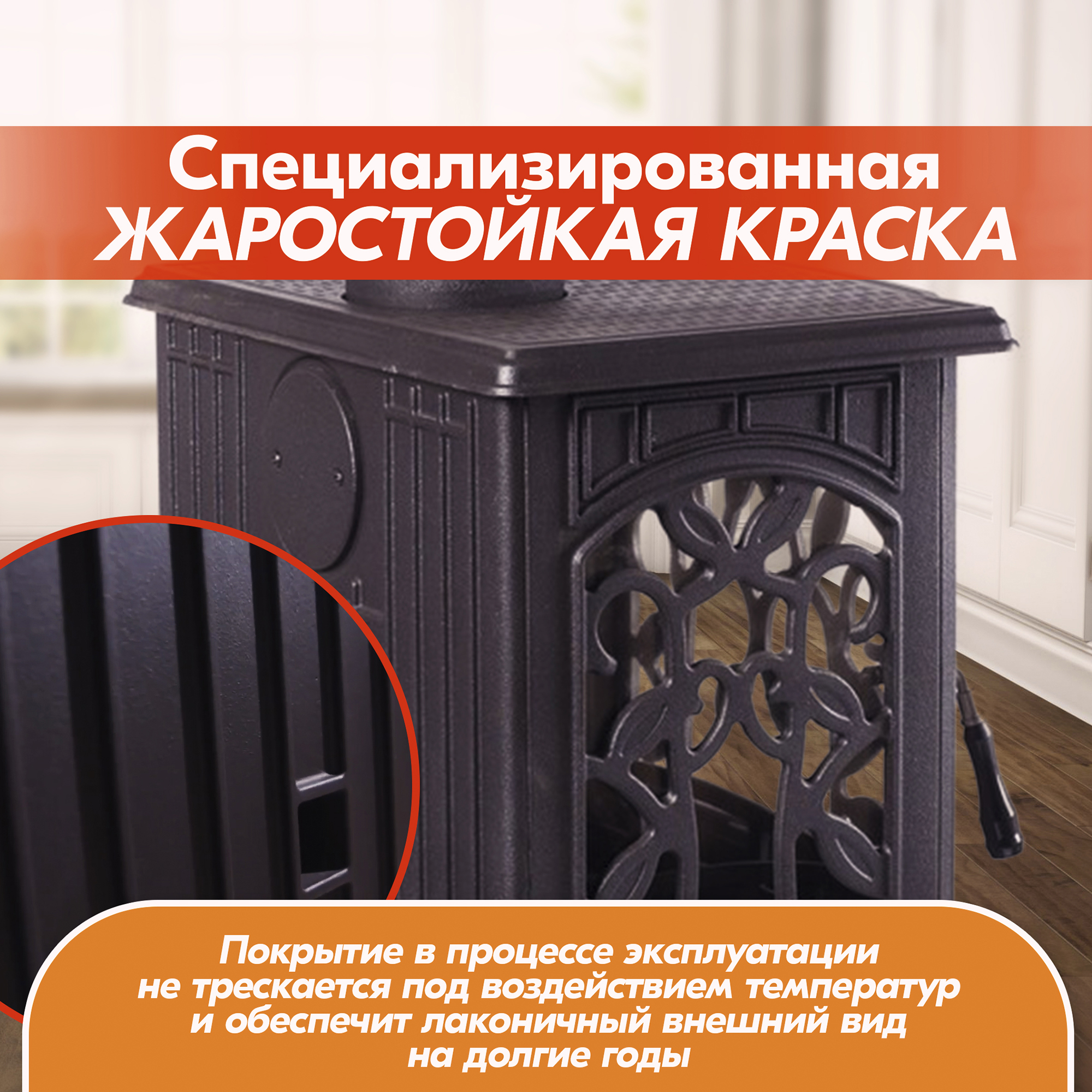 Боковые стенки и дверца печи-камина оформлены большими окнами из огнеупорного стекла, дополненными цветочным узором из чугуна.