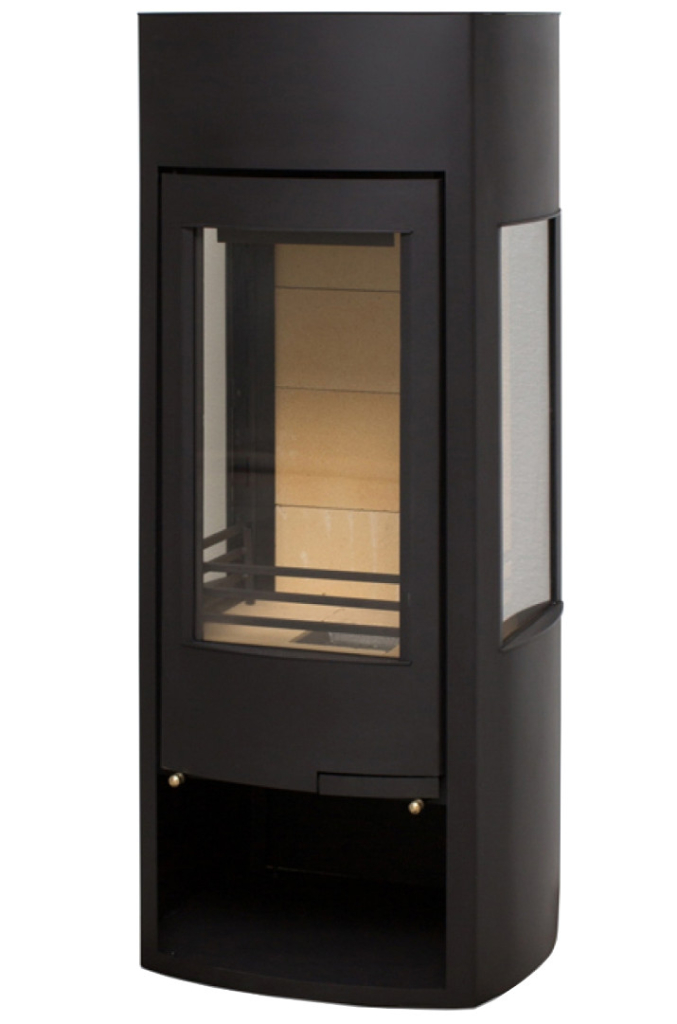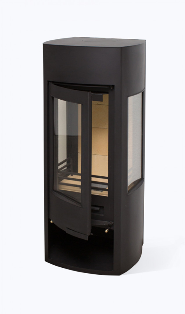 Пристенная высокая дизайнерская печь с панорамным обзором. Обзор огня с трех сторон. Оборудована большой остекленной дверкой выполненной в одной плоскости с корпусом печи и с двумя боковыми стеклами. Дверка высотой 600 мм и боковые стенки выполнены с небольшим радиальным изгибом. Ручка открывания утоплена внутрь дверки. Подсоединение к дымоходу сверху или сзади.