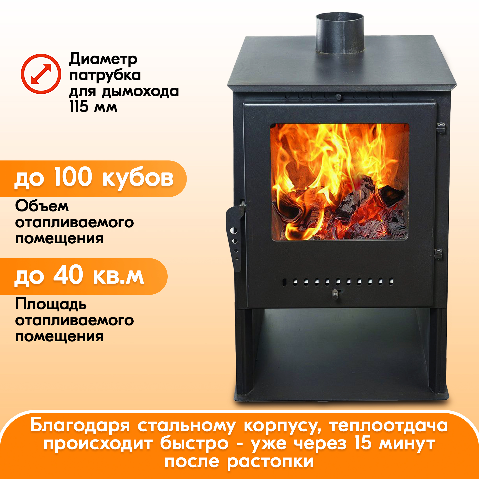 Благодаря стальному корпусу, печка быстро прогревает воздух в помещении.