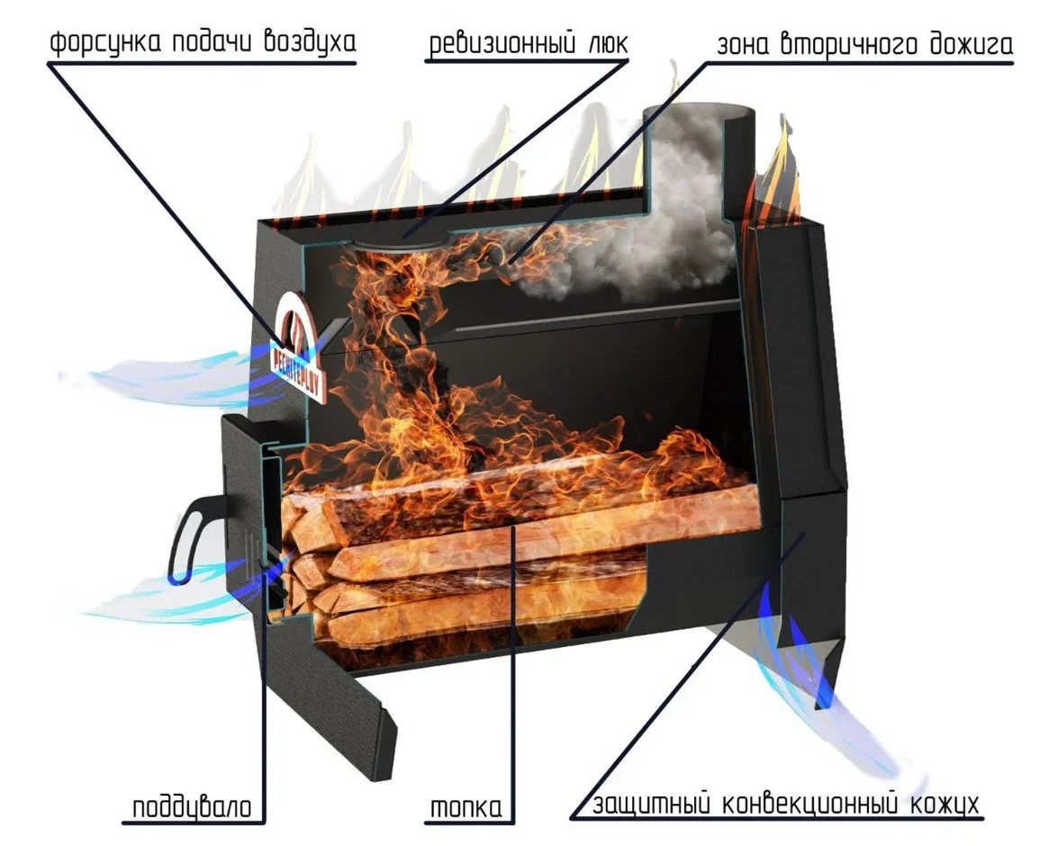 Боковые стенки - это конвекторы, которые увеличивают полезную площадь печи. Благодаря такой конструкции максимально эффективно прогревается окружающий воздух и создается циркуляция теплого потока в помещении.